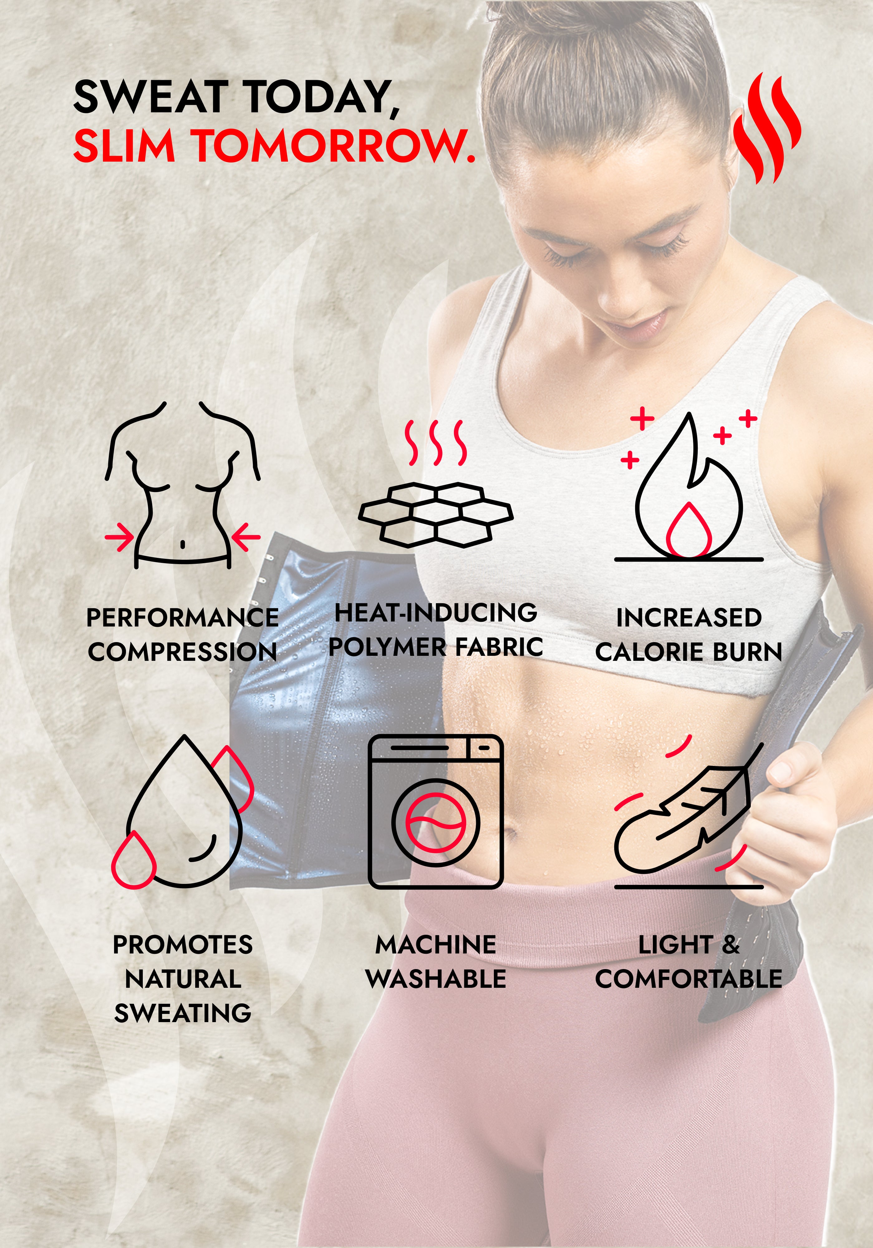 The Sweat Shaper Waist Trainer creates an hourglass figure with superior compression while supporting increased weight loss through heat acceleration. With spiral steel boning, triple rows of hook and eye closure, and an additional flexible support strap for a perfect fit, this product gently shapes your waist. Our exclusive blend of performance compression and polymer fabrics work together to accelerate your natural body heat and create an intense sauna-like experience. Lightweight and comfortable, allowing for a full range of motion during workouts, cardio, and daily activities. Due to continued product enhancements, the product image may differ slightly from the actual product purchased.